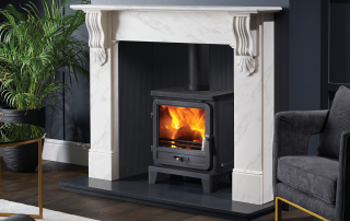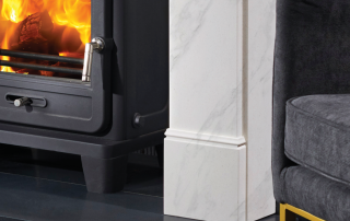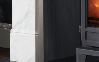 Pictured: Nuffield 56″ Bianco Marble, Black Reeded Fireboard Chamber, Vega 200SL Eco Stove, Honed Granite Hearths.