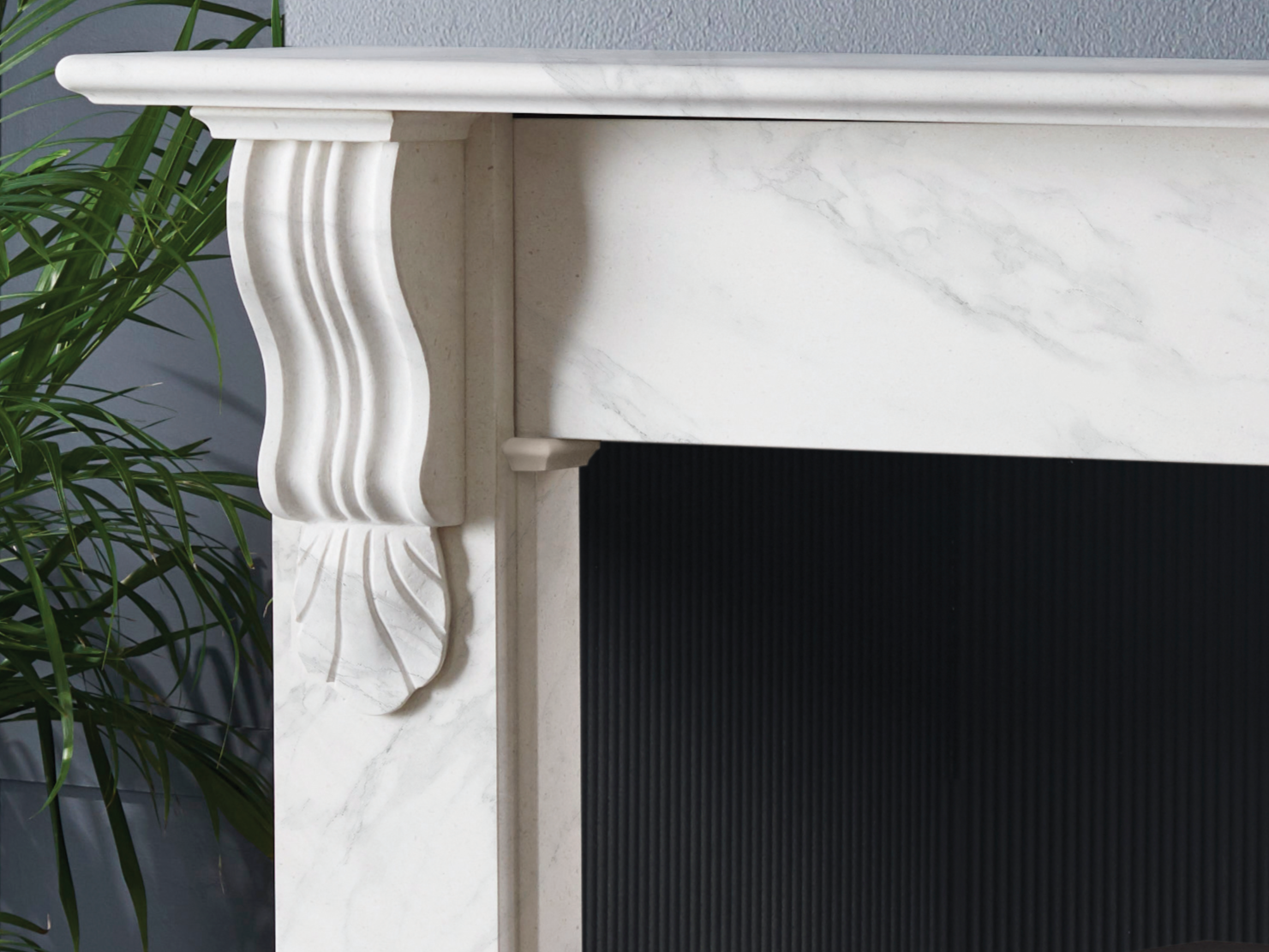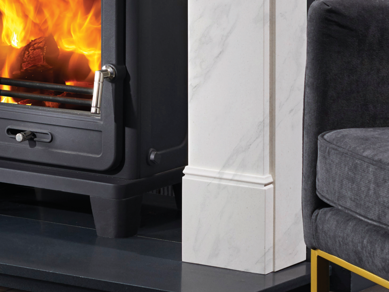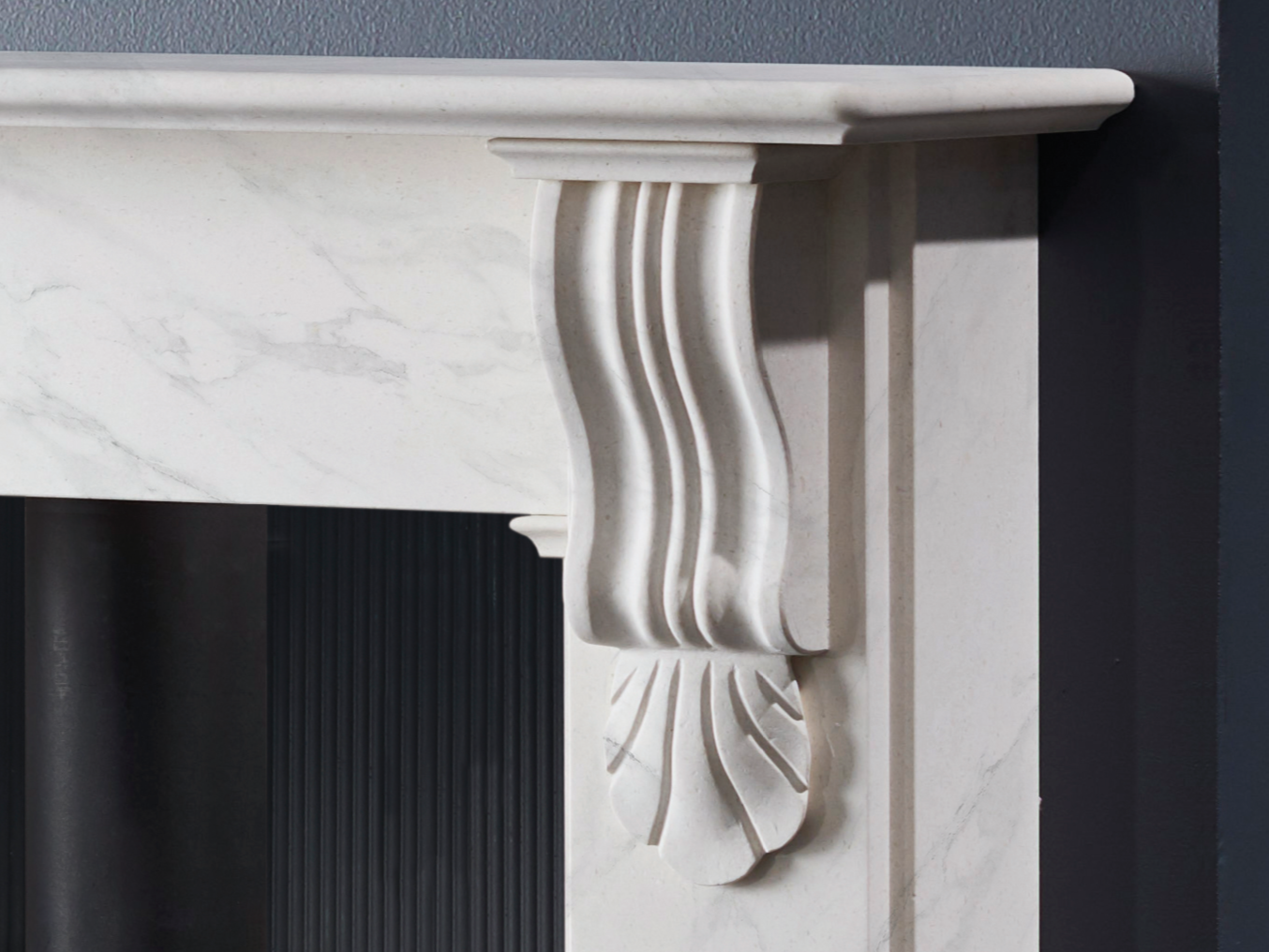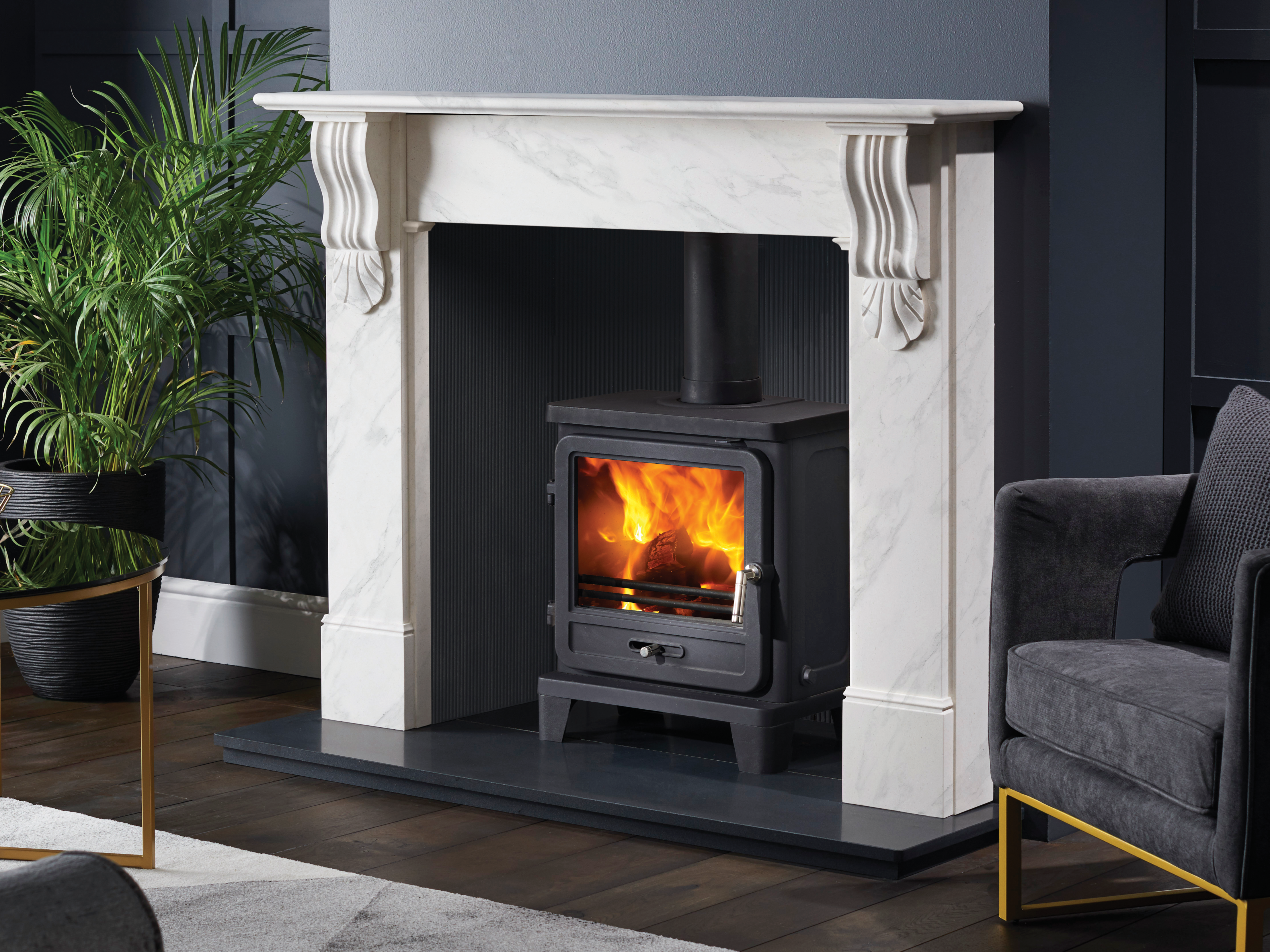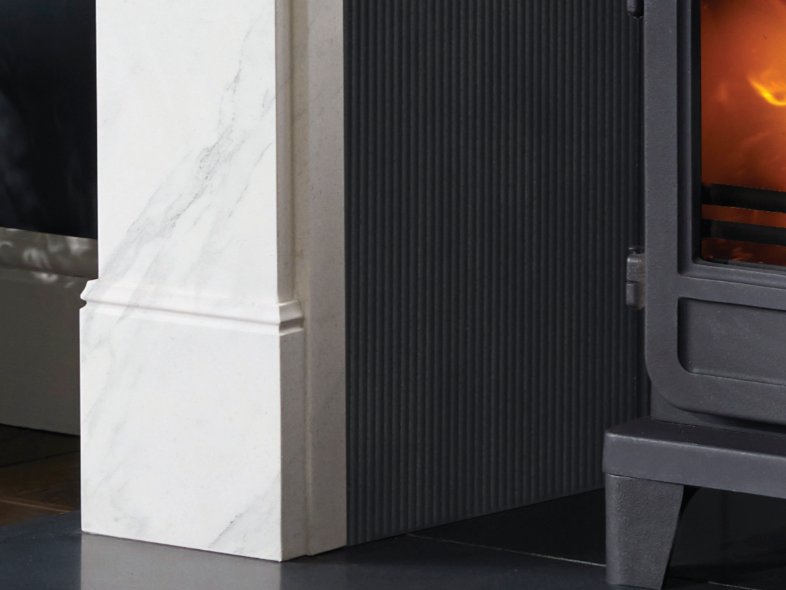 Pictured: Nuffield 56″ Bianco Marble, Black Reeded Fireboard Chamber, Vega 200SL Eco Stove, Honed Granite Hearths.