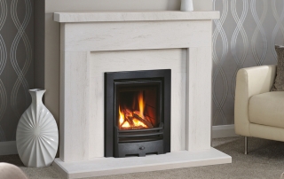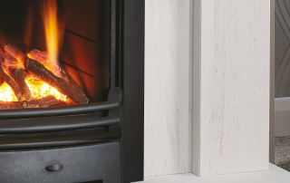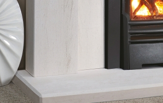 Pictured in Portuguese Limestone with the DL400 Gas Inset Fire with a 3 Sided Trim and Baltimore Fret. The Belmonte is available in sizes 48″ (as shown) and 42″ and can be supplied in the following natural stones